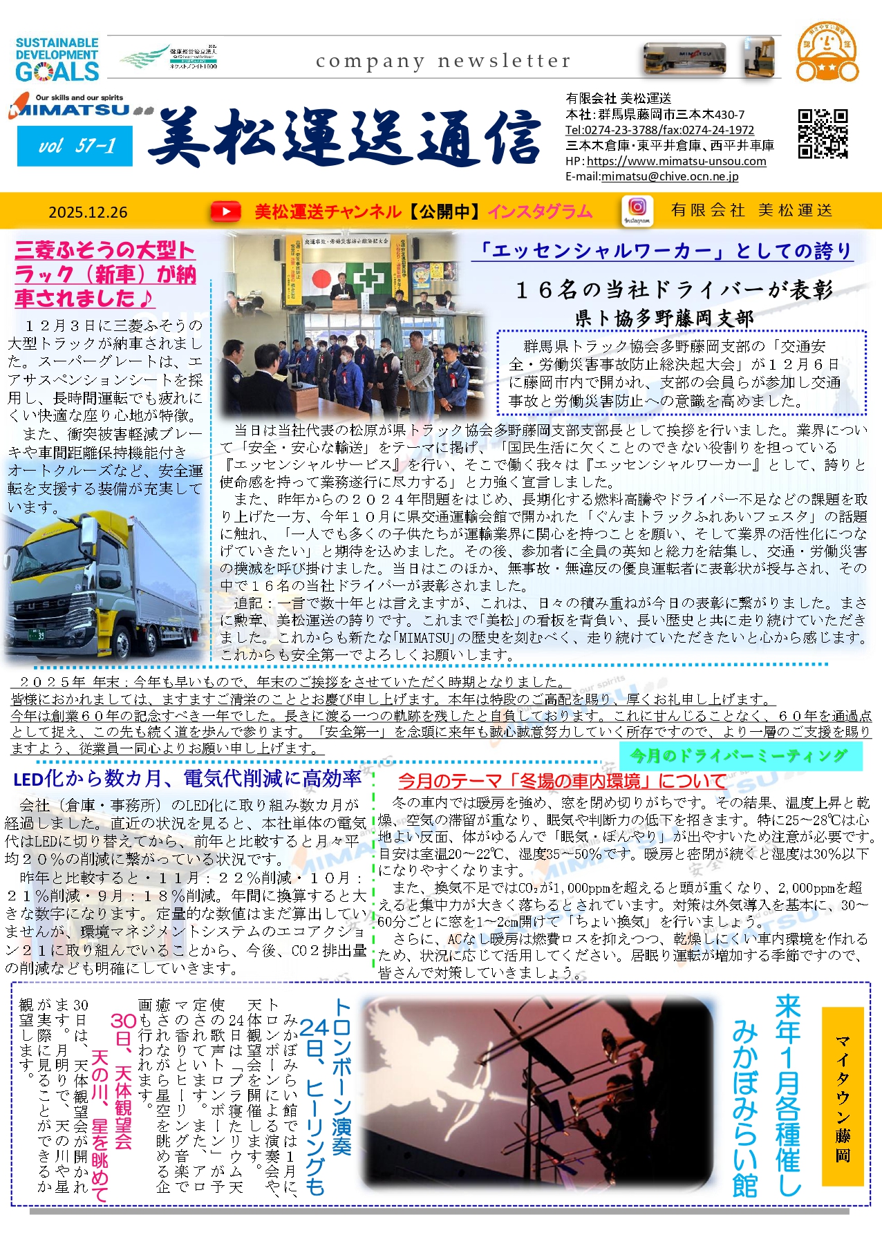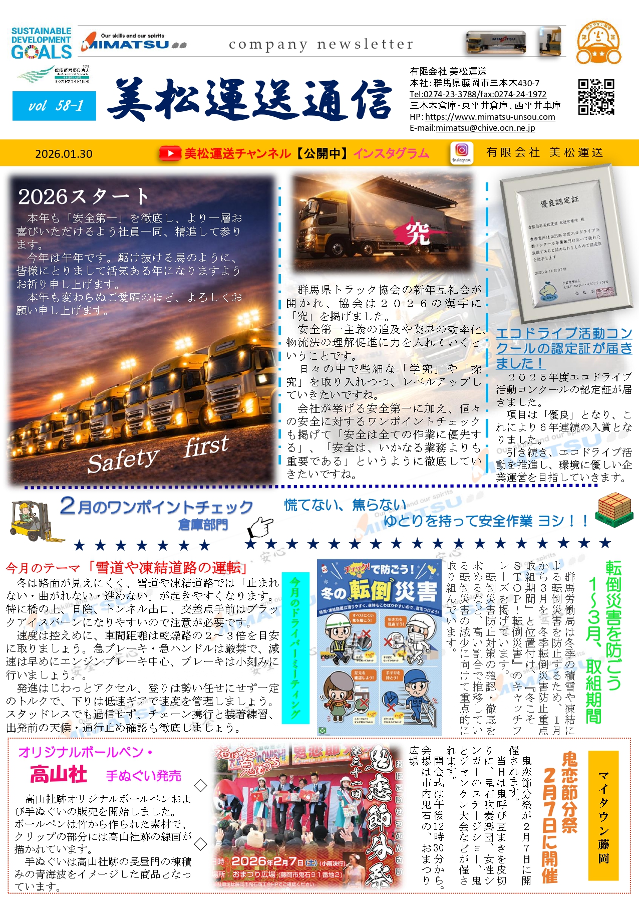 美松運送は、昭和40年藤岡市の産業の要であった<瓦>の輸送から始まり、自動車部品を中心にあらゆる荷物の輸送を行ってまいりました。お客様の要望に応えるため、社員一人ひとりがあらゆる方向からなにができるのかを真剣に考えて実行しています。お客様と共に歩み、物流環境の最適化を提案し続けてまいります。