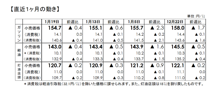 経済産業省・資源エネルギー庁の最新の発表(1/21)によると、群馬県のレギュラー価格の平均は152.6円、軽油は141.5円となりました。 全国平均はレギュラーが154.7円、軽油は143円で、いずれも10周連続の値下 …