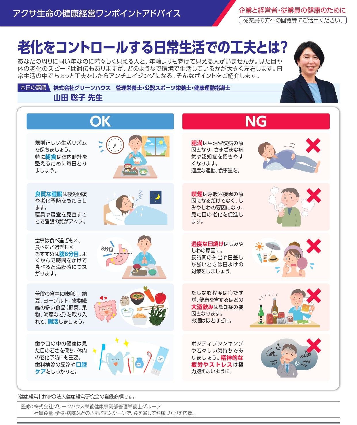 【健康への第一歩】日々の生活で老化をコントロール! 2025年12月18日 2025年12月17日 老化をコントロールする日常生活での工夫について! 毎日、朝食をとることが基本で、このほか、良質な睡眠、食物繊維の多い食品を摂るなど個々の自覚が必要です。 各種NG項目もありますので、下記を参考にしましょう。 情報提供はアクサ生命保険㈱様からです。