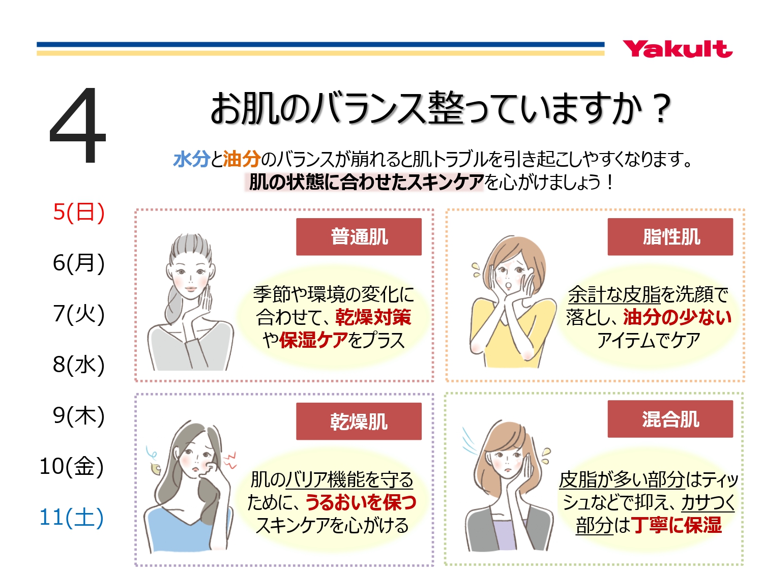紫外線が急激に強くなりますので、乳液や美容液などで対策を行いましょう。