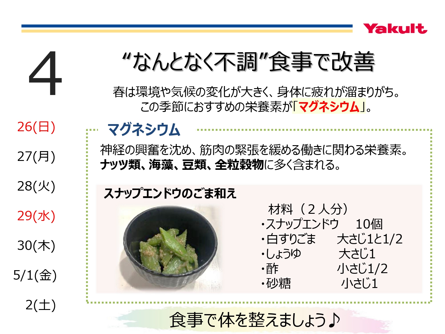 この時期は体に疲れが溜まりやすくなりますので、筋肉の緊張を緩める働きに関わる栄養素「マグネシウム」を含んだ食べ物を摂りましょう。