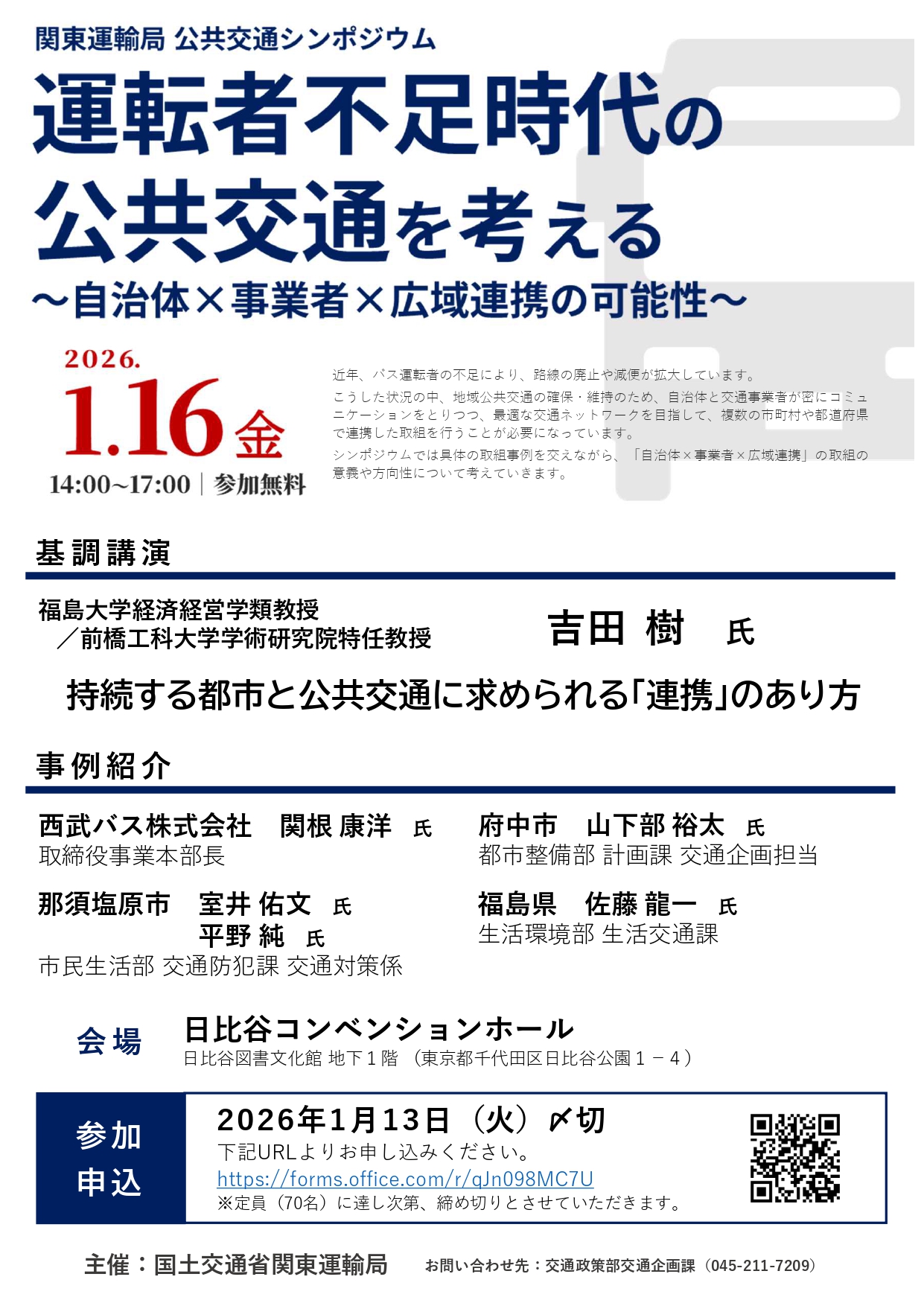 【国交省情報】1/16、運転者不足時代の公共交通を考えるシンポジウム 2025年12月23日 2025年12月22日 国交省関東運輸局は来年1月16日、公共交通シンポジウムを開催します。 テーマは「運転者不足時代の公共交通を考える~自治体×事業者×広域連携の可能性~」 当日は基調講演をはじめ、4つの事例を紹介しつつ、地域公共交通の確保・維持の方策を探ります。