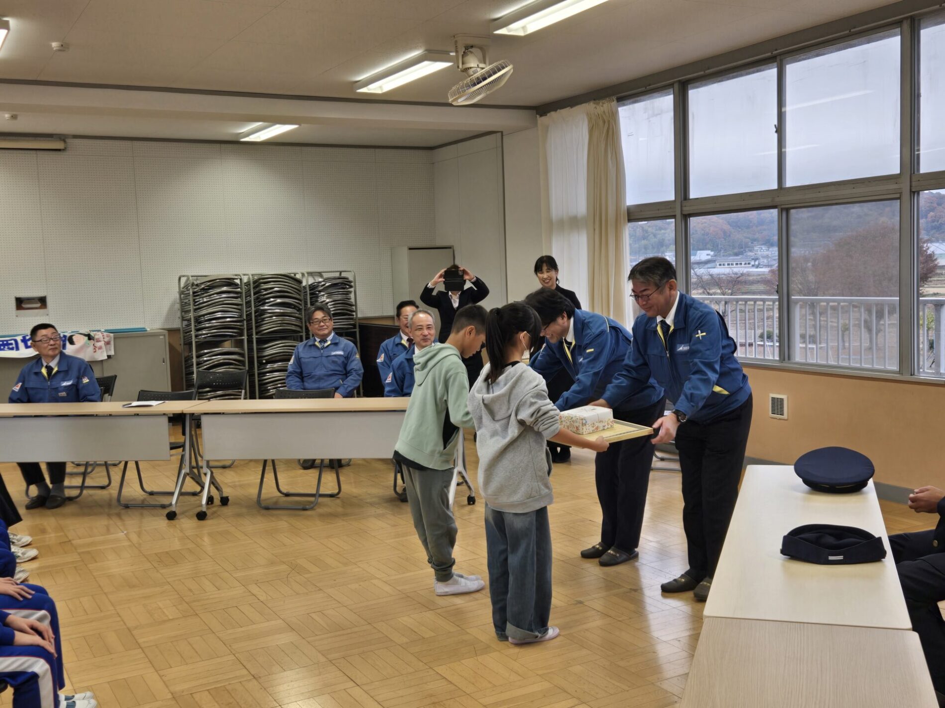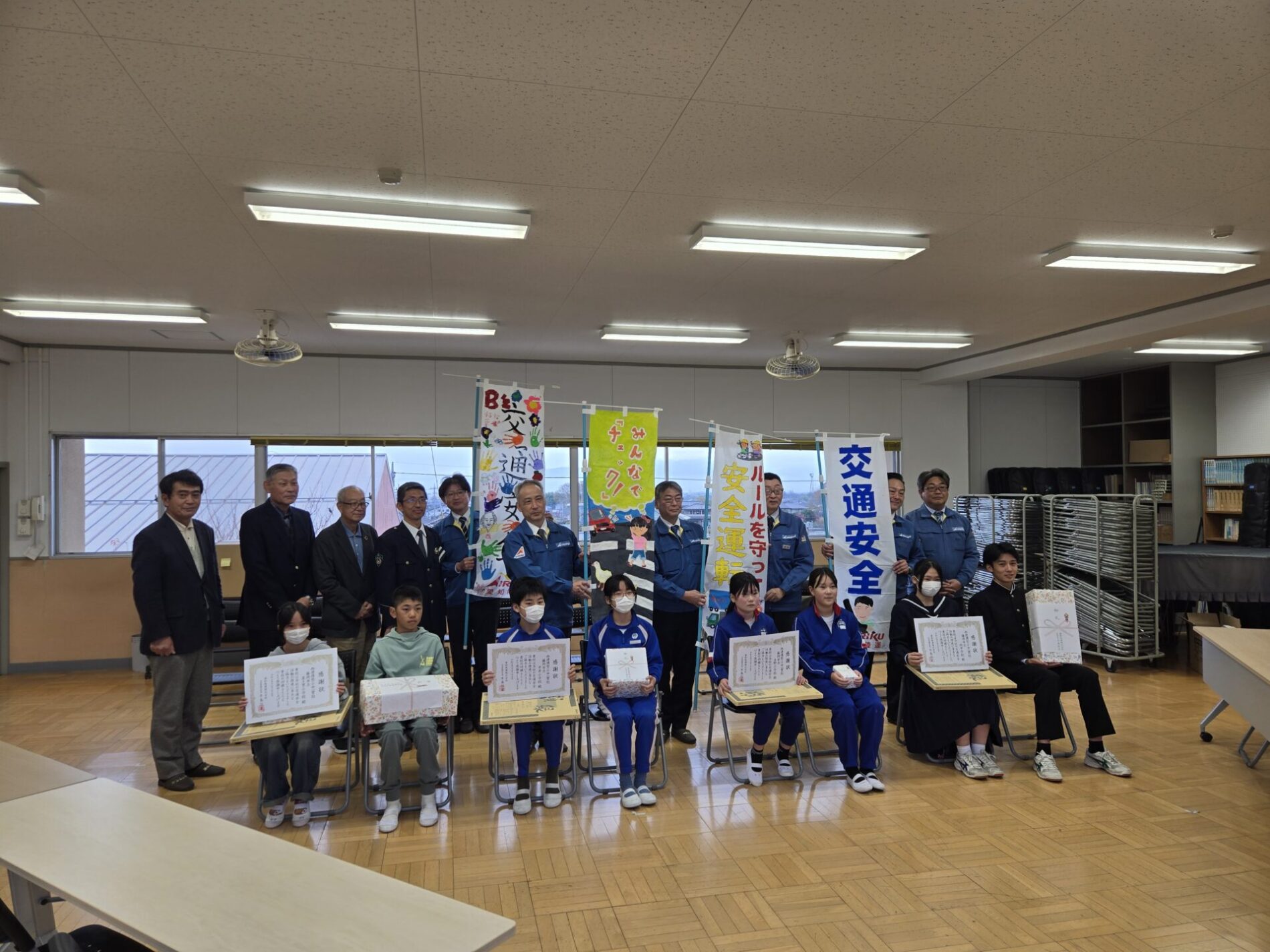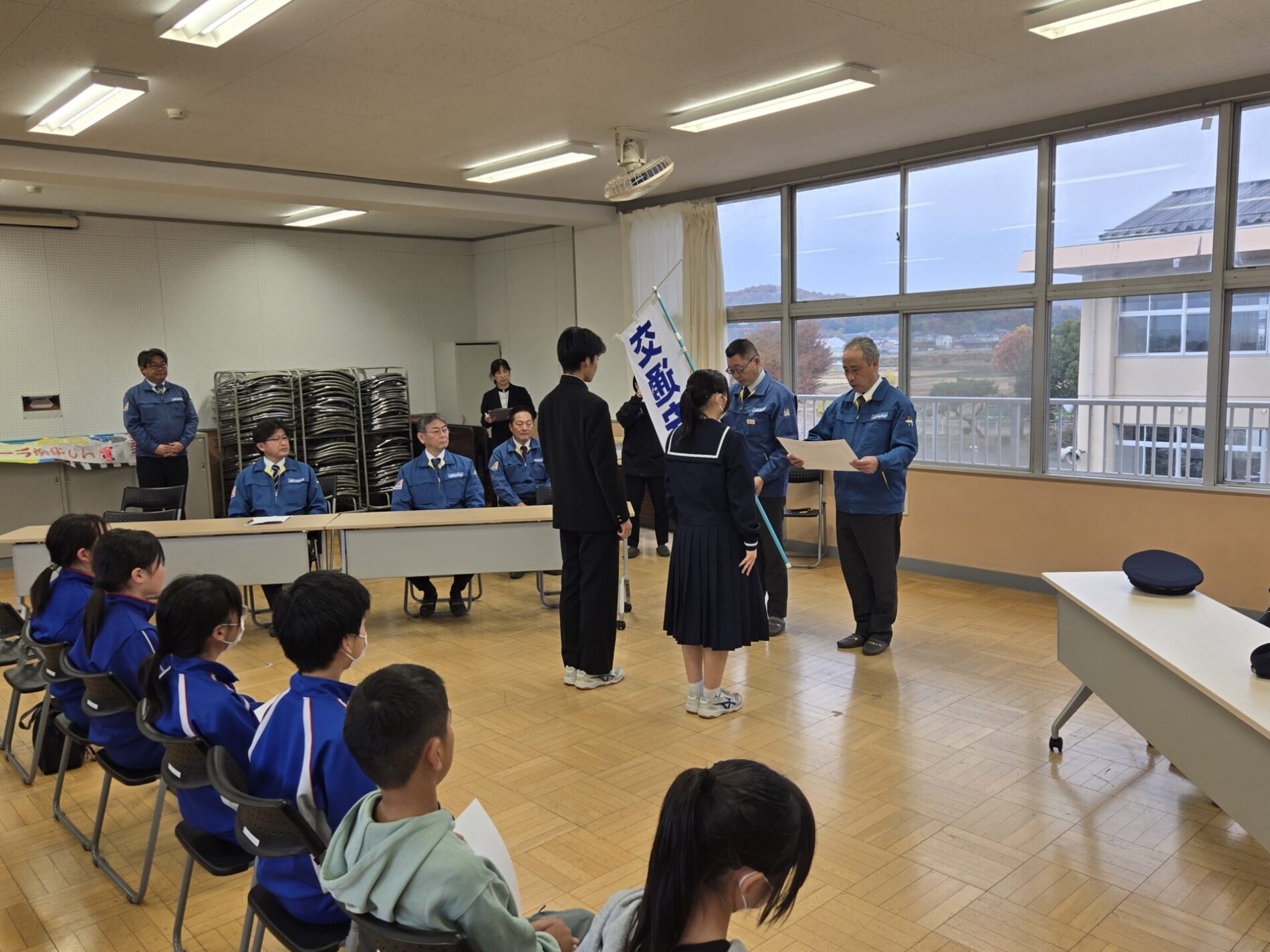 贈呈・授与式では児童会・生徒会から、のぼり旗が贈られ、その後、愛知陸運㈱から感謝状が授与されました。