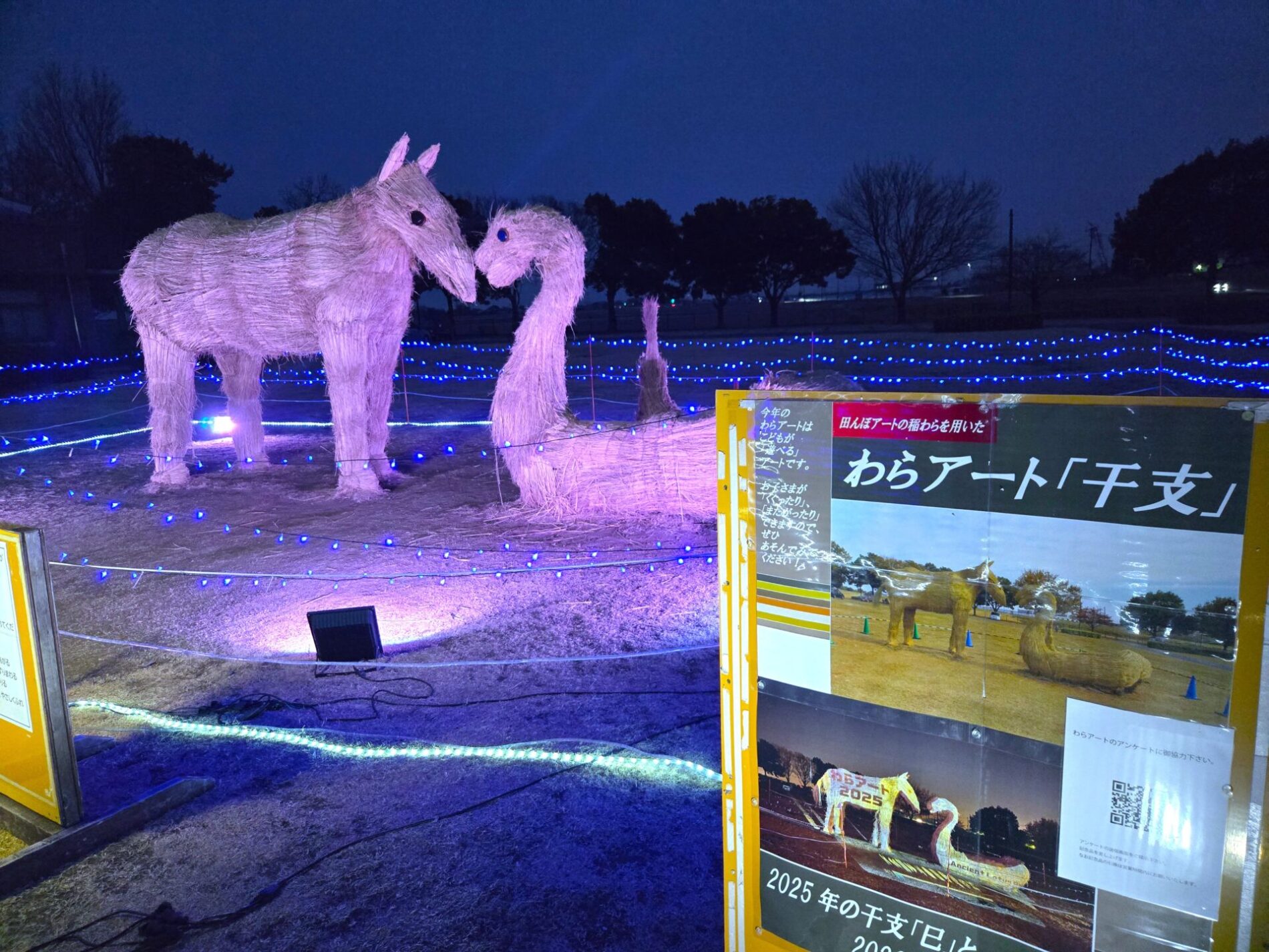 期間中は「わらアート」が登場!田んぼアートの稲わらを使用し、令和7年の干支の「へび」と令和8年の干支の「うま」をモチーフに制作され、イルミネーションに華を添えました。