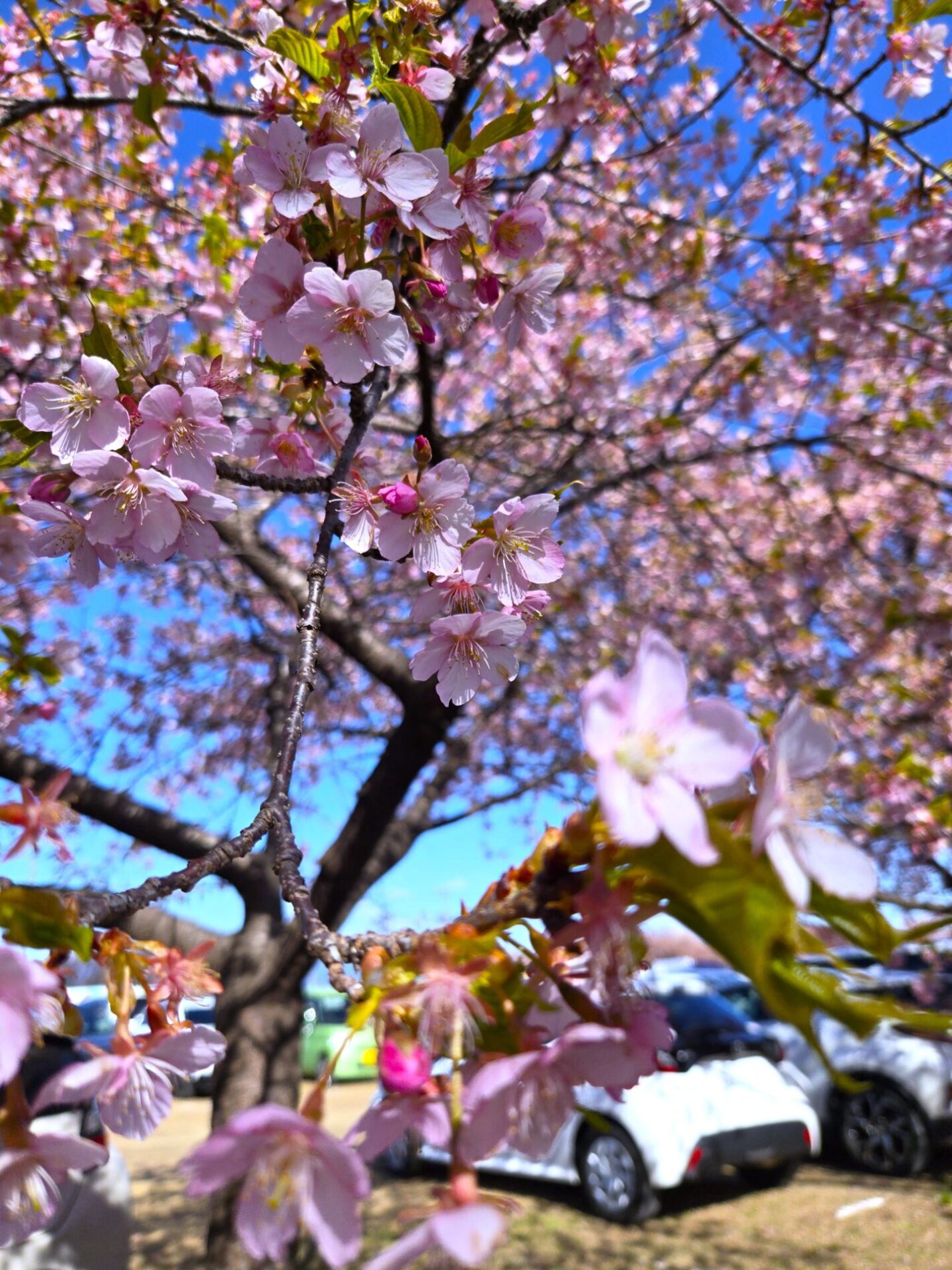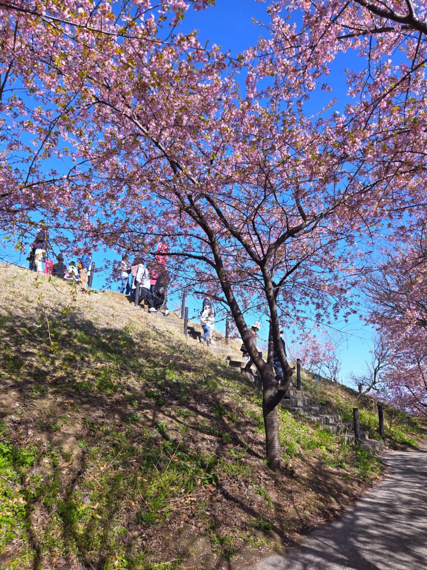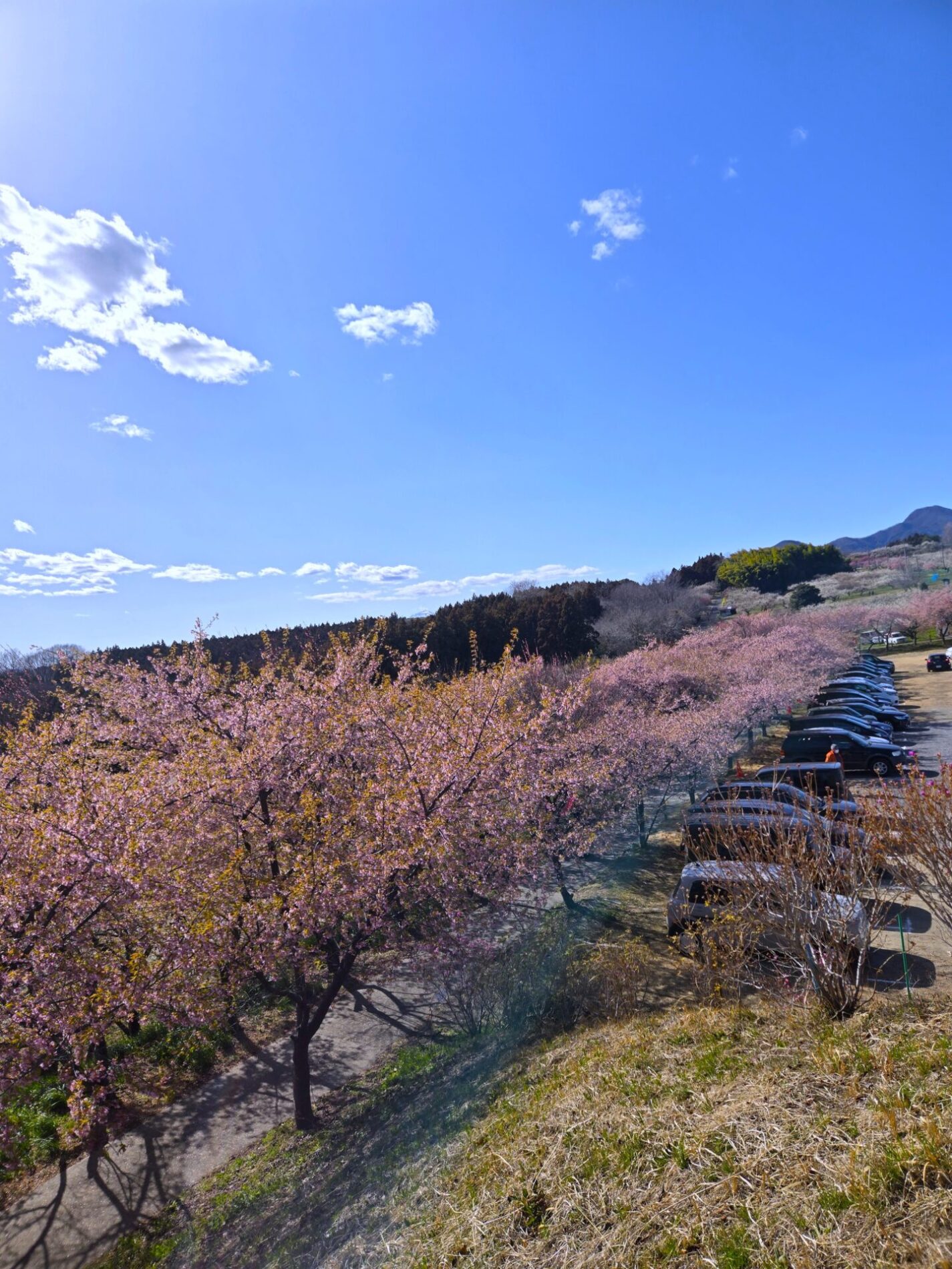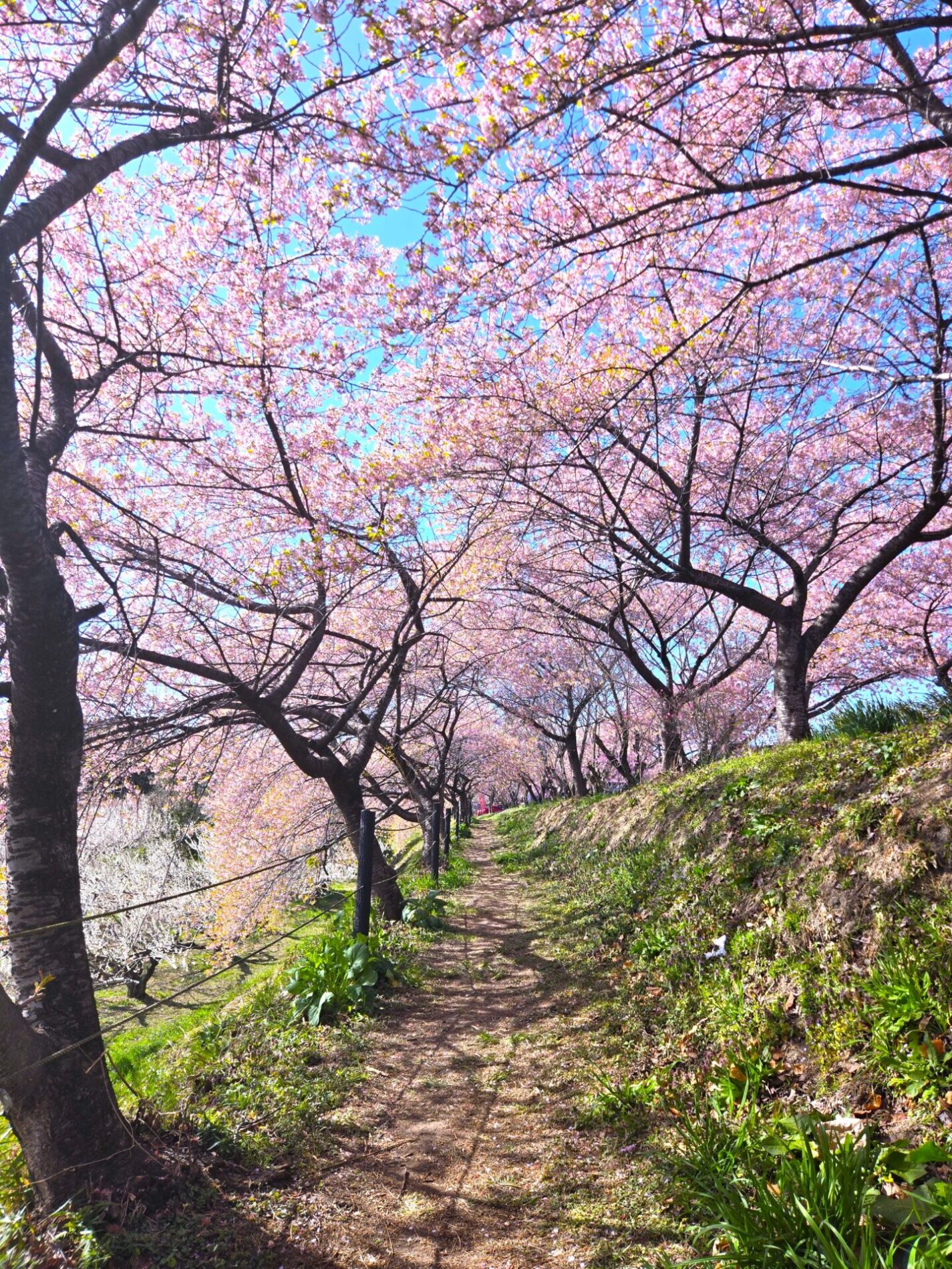 河津桜が自然のトンネルをつくり見物客を魅了。そして梅林と見事な共演を果たしていました。