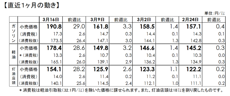 経済産業省・資源エネルギー庁が18日に発表した16日現在の石油製品価格調査によると、レギュラーガソリンは全国平均で1リットル当たり190.8円で5週連続の値上がり、軽油は同178.4円で同じく5週連続の値上がりとなりました。