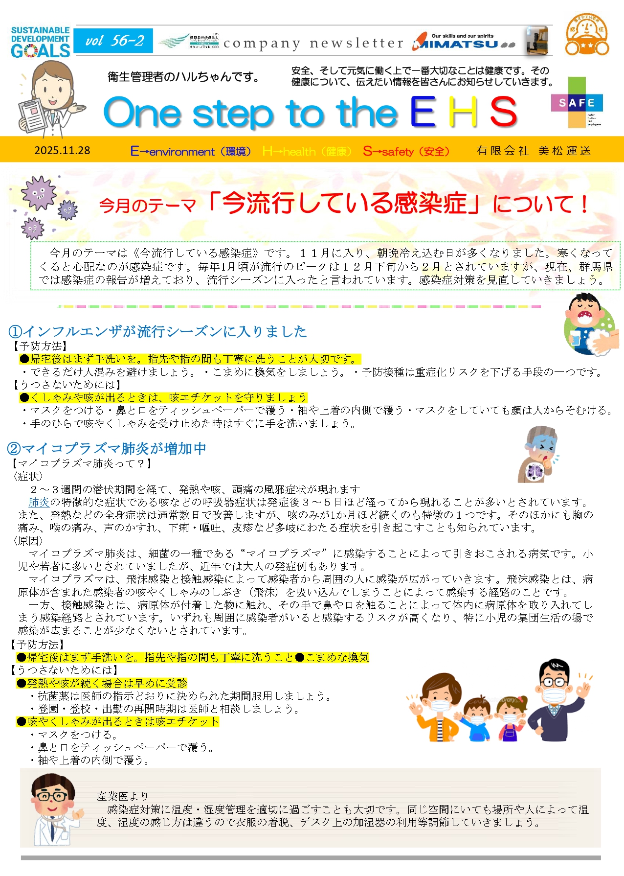 衛生管理者のハルちゃんのコーナーでは、「今流行している感染症」について解説していますので、参考にしてください。